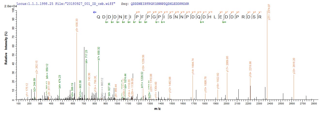 Based on the SEQUEST from database of E.coli host and target protein, the LC-MS/MS Analysis result of CSB-EP841983RCIa2 could indicate that this peptide derived from E.coli-expressed Reston ebolavirus (strain Philippines-96) (REBOV) (Reston Ebola virus) NP.