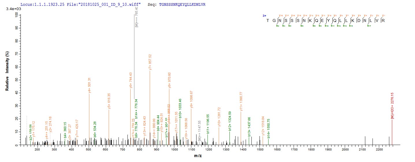 Based on the SEQUEST from database of E.coli host and target protein, the LC-MS/MS Analysis result of CSB-EP361171SVG could indicate that this peptide derived from E.coli-expressed SaccharoMyces cerevisiae (strain ATCC 204508 / S288c) (Baker's yeast) FLP1.
