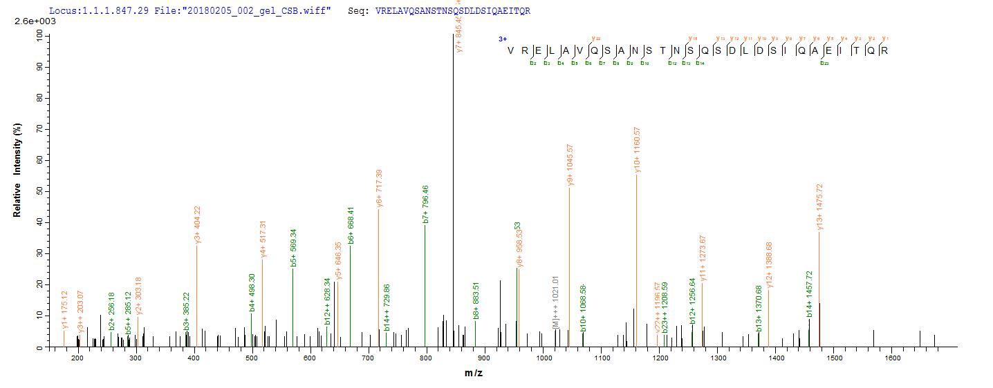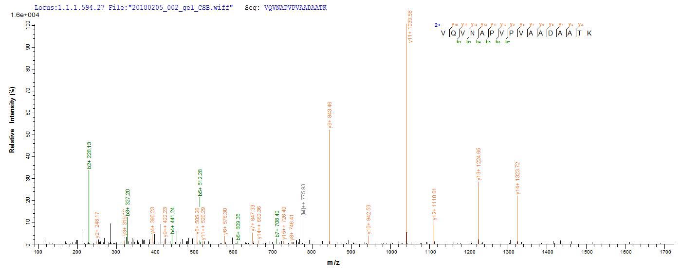 Based on the SEQUEST from database of E.coli host and target protein, the LC-MS/MS Analysis result of CSB-EP2372e1 could indicate that this peptide derived from E.coli-expressed Salmonella enterica I fljB.