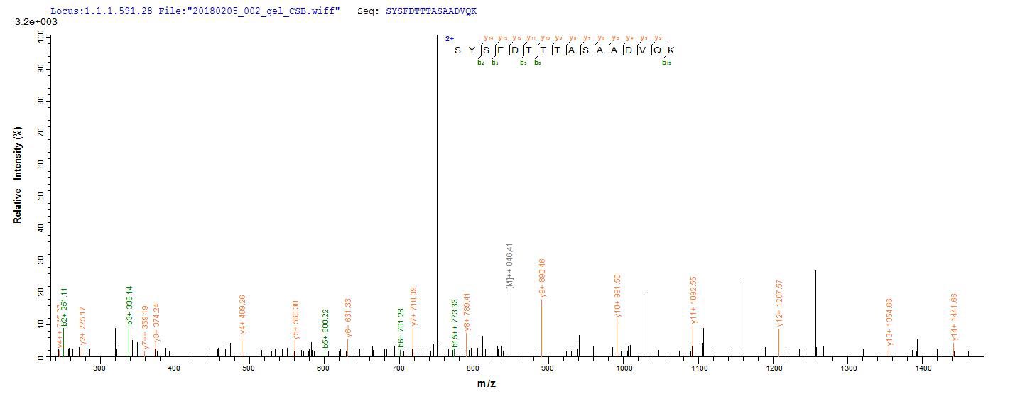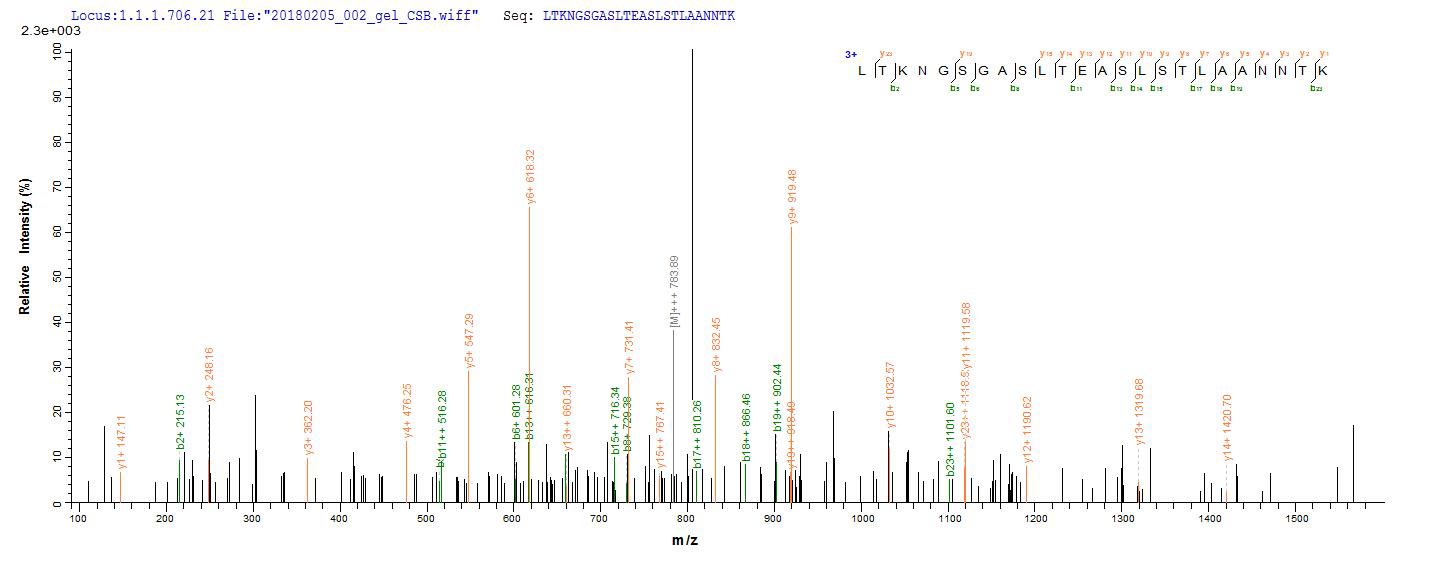 Based on the SEQUEST from database of E.coli host and target protein, the LC-MS/MS Analysis result of CSB-EP600904SZB could indicate that this peptide derived from E.coli-expressed Shigella flexneri fliC.