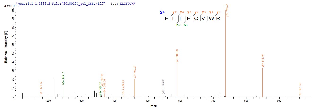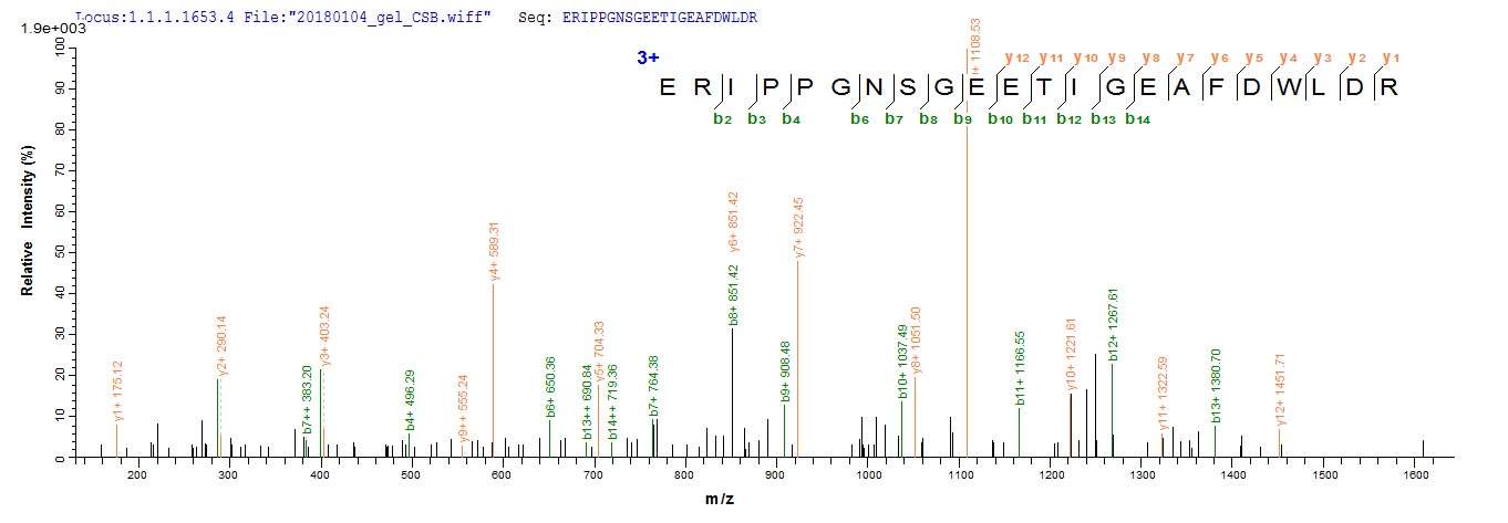 Based on the SEQUEST from database of E.coli host and target protein, the LC-MS/MS Analysis result of CSB-EP323941SHD could indicate that this peptide derived from E.coli-expressed Simian immunodeficiency virus (isolate PBj14/BCL-3) (SIV-sm) (Simian immunodeficiency virus sooty mangabey monkey) vpx.