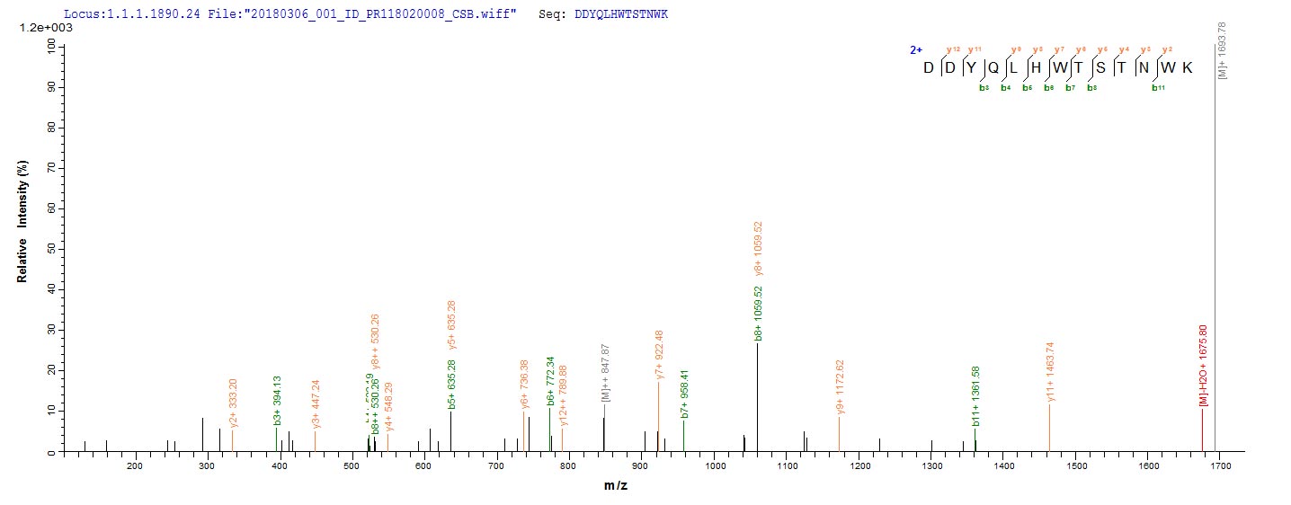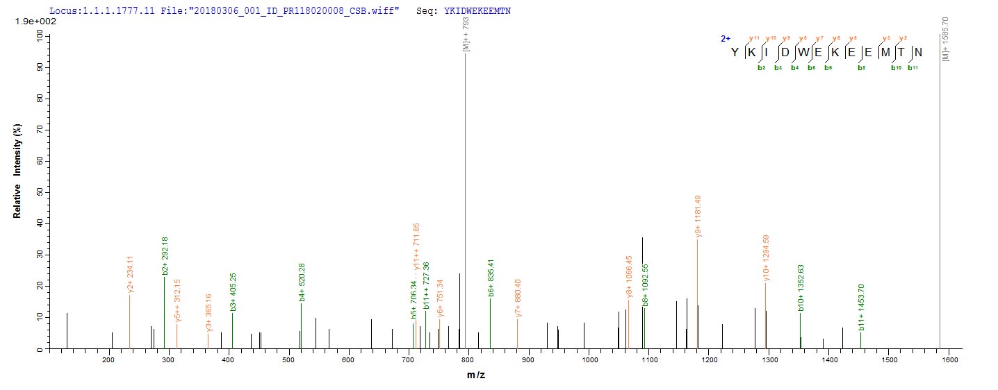 Based on the SEQUEST from database of Yeast host and target protein, the LC-MS/MS Analysis result of CSB-YP639324FLF could indicate that this peptide derived from Yeast-expressed Staphylococcus aureus (strain NCTC 8325) hly.