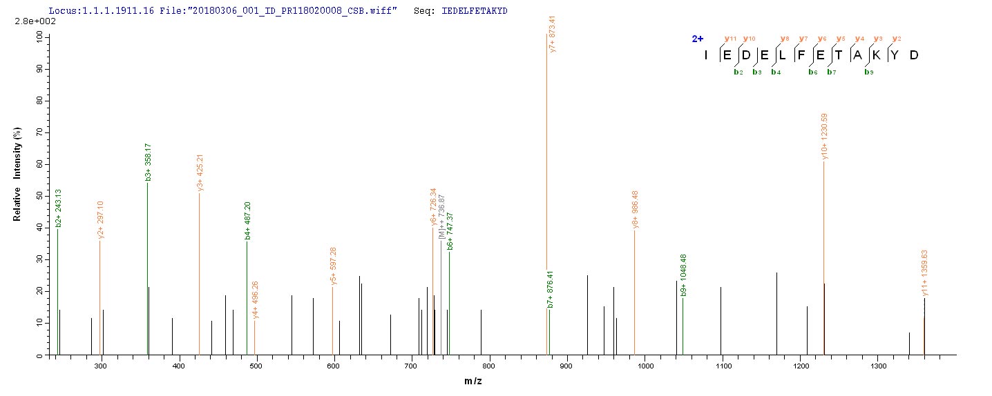 Based on the SEQUEST from database of E.coli host and target protein, the LC-MS/MS Analysis result of CSB-EP351974SKX could indicate that this peptide derived from E.coli-expressed Staphylococcus aureus (strain Mu50 / ATCC 700699) eno.
