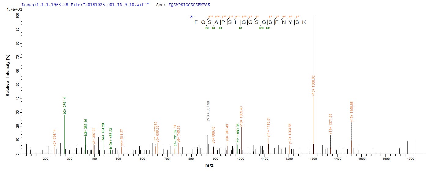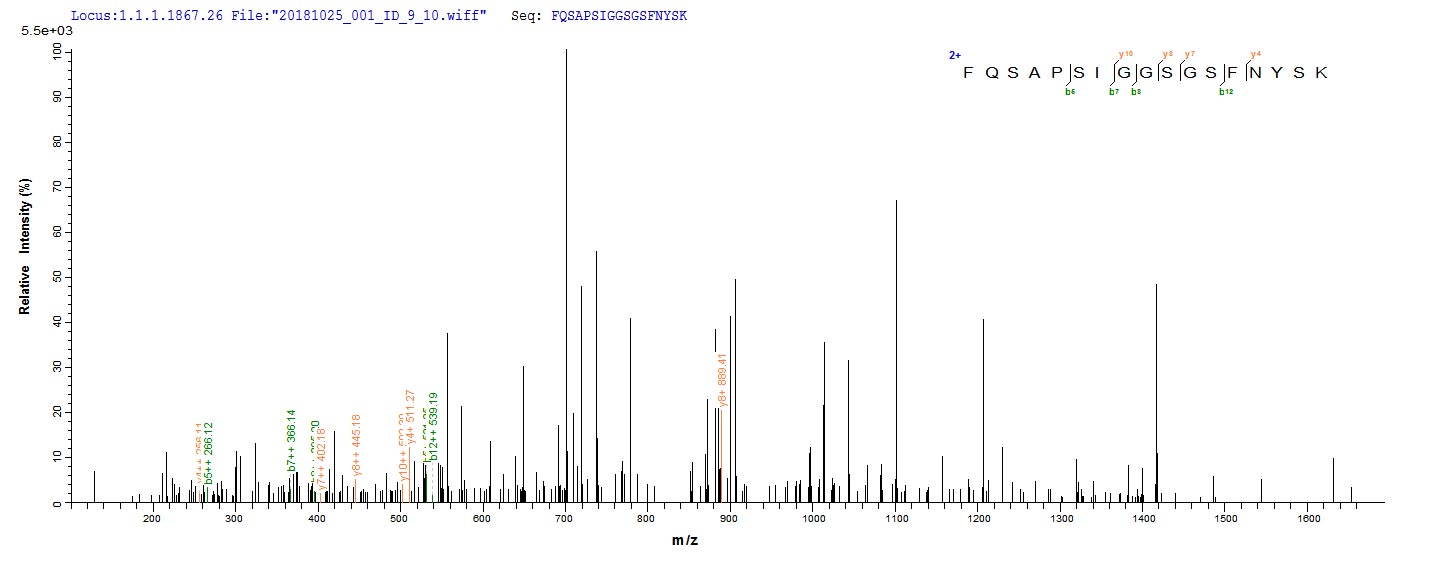 Based on the SEQUEST from database of E.coli host and target protein, the LC-MS/MS Analysis result of CSB-EP357861SUL could indicate that this peptide derived from E.coli-expressed Staphylococcus aureus (strain MW2) hlgA.