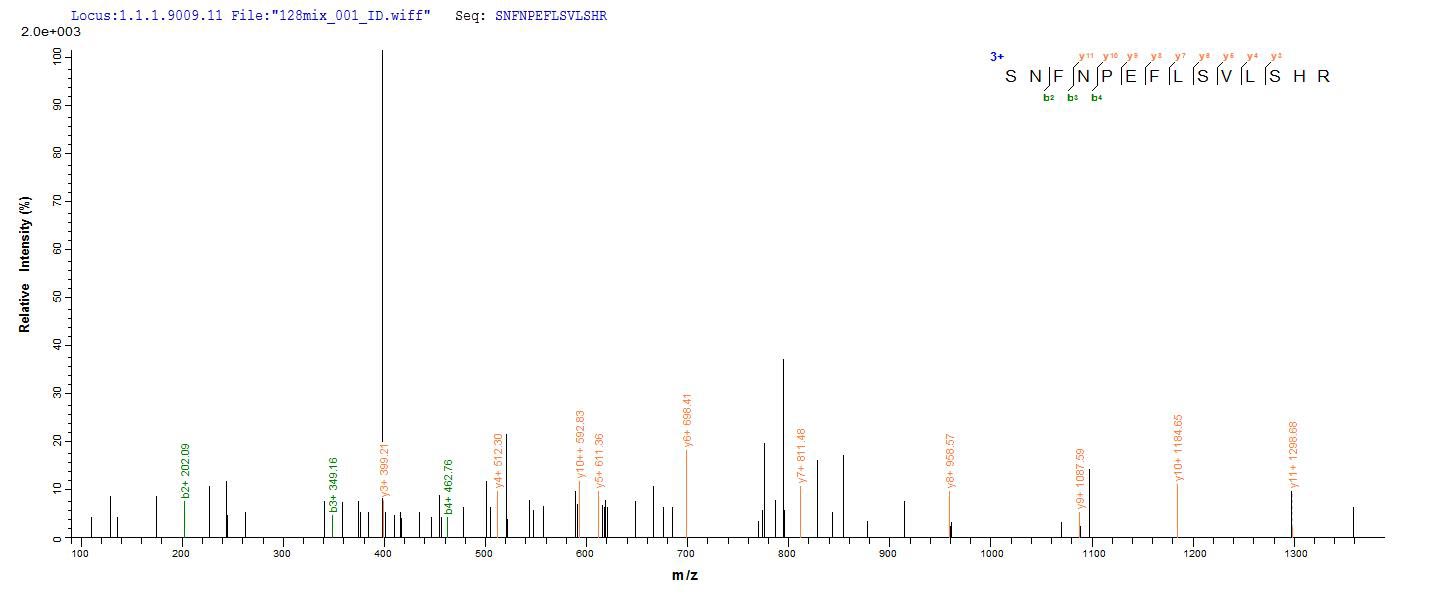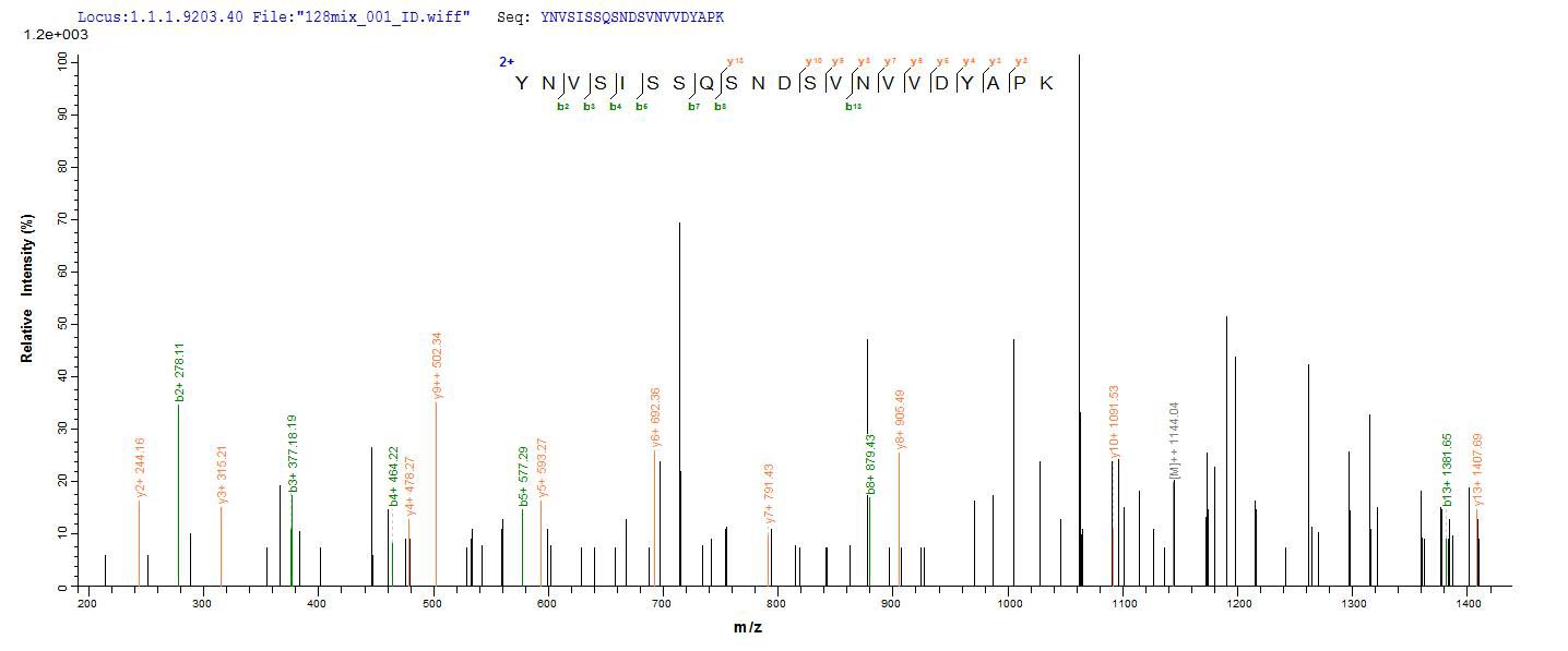 Based on the SEQUEST from database of E.coli host and target protein, the LC-MS/MS Analysis result of CSB-EP357862SKY could indicate that this peptide derived from E.coli-expressed Staphylococcus aureus (strain N315) hlgB.
