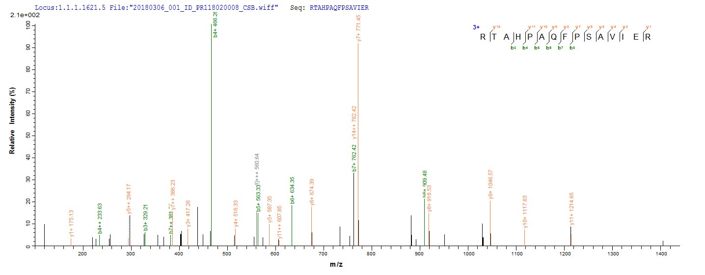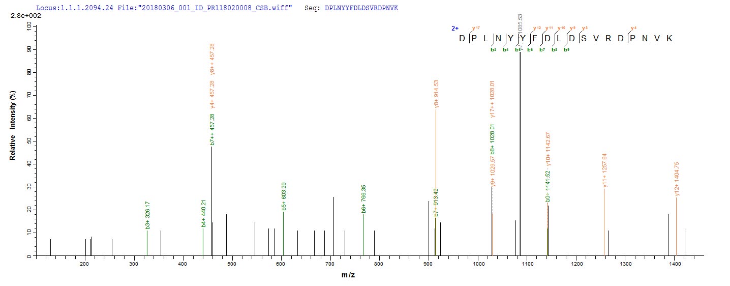 Based on the SEQUEST from database of E.coli host and target protein, the LC-MS/MS Analysis result of CSB-EP528741FNZ could indicate that this peptide derived from E.coli-expressed Streptomyces caespitosus scaIM.