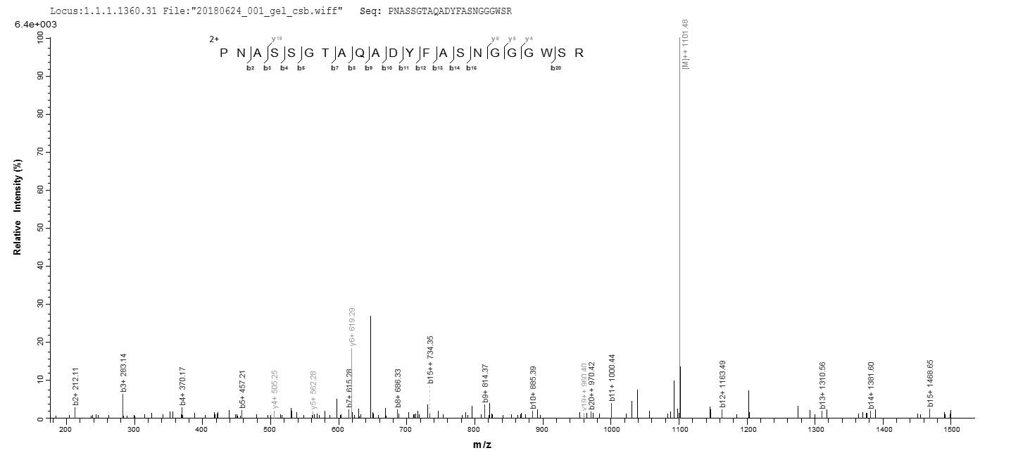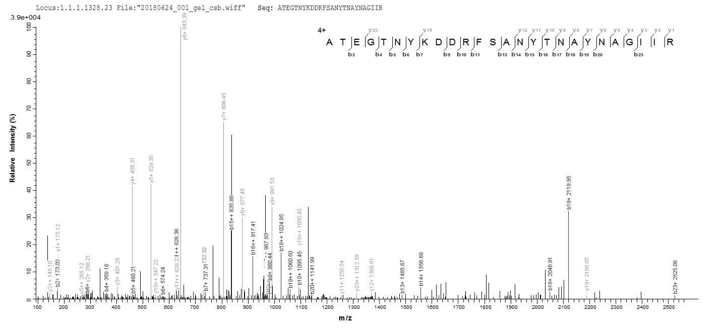 Based on the SEQUEST from database of E.coli host and target protein, the LC-MS/MS Analysis result of CSB-EP326536SOH could indicate that this peptide derived from E.coli-expressed Streptomyces globisporus acm.
