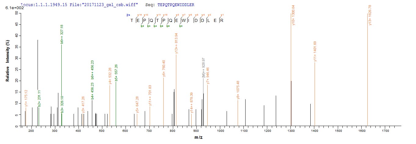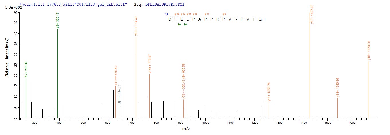 Based on the SEQUEST from database of Yeast host and target protein, the LC-MS/MS Analysis result of CSB-YP701139FOQ could indicate that this peptide derived from Yeast-expressed Streptomyces viridochromogenes (strain DSM 40736 / JCM 4977 / BCRC 1201 / Tue 494) pat.