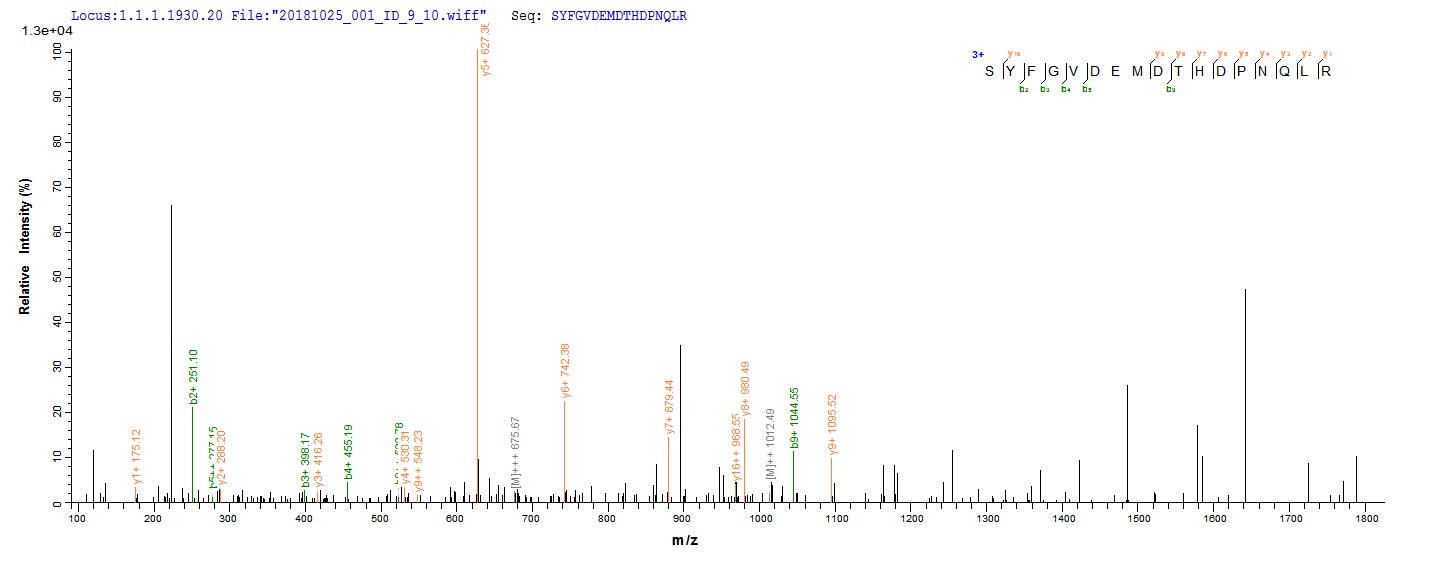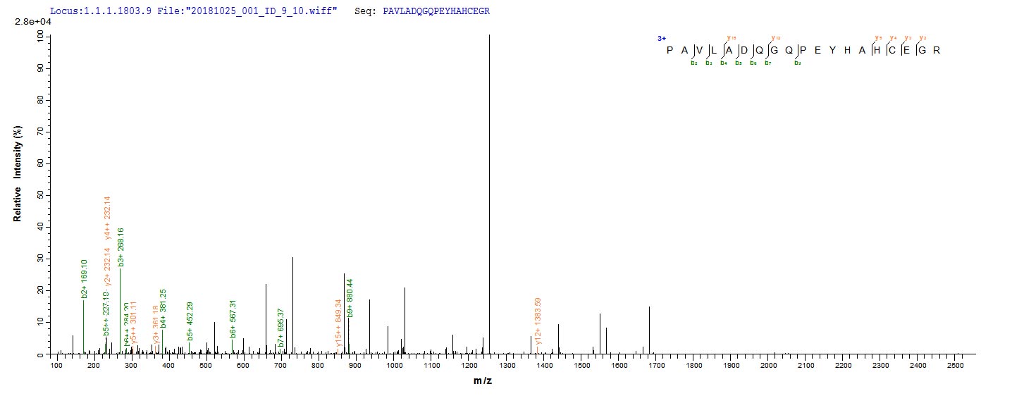 Based on the SEQUEST from database of E.coli host and target protein, the LC-MS/MS Analysis result of CSB-EP806800VBF could indicate that this peptide derived from E.coli-expressed Vesicular stomatitis Indiana virus (strain 98COE North America) (VSIV) M.