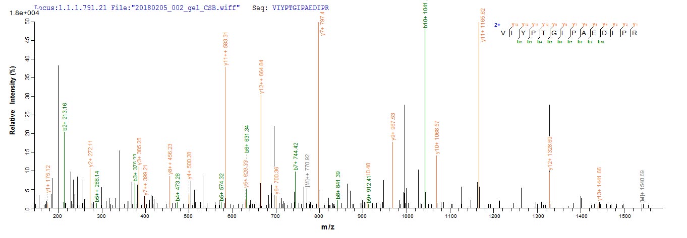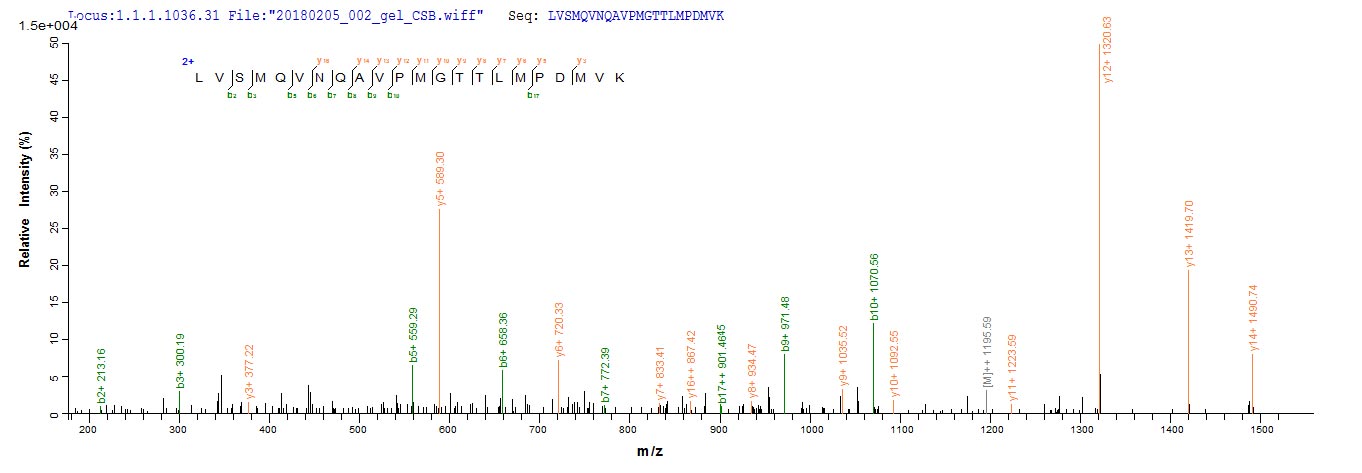 Based on the SEQUEST from database of E.coli host and target protein, the LC-MS/MS Analysis result of CSB-EP325687MAQ could indicate that this peptide derived from E.coli-expressed Zoarces americanus (Ocean pout) (Macrozoarces americanus) N/A.