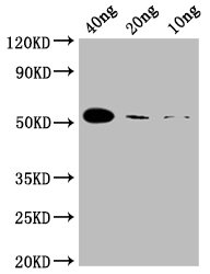 Positive WB detected in: SARS-CoV-2 N recombinant protein (CSB-EP3325GMY) at 40ng, 20ng, 10ng; All lanes N antibody (CSB-MA33255A0m) at 1:1000