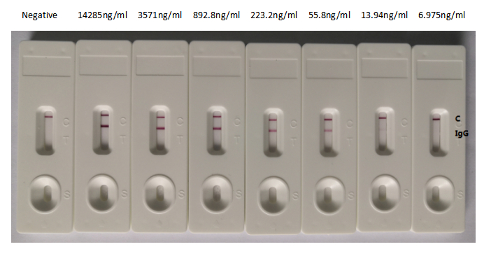 In the GICA detection system, the background of antibody (CSB-RA33255A2GMY) is clean, the detection limit can be as low as 15.625ng/mL (1.09ng/0.07mL), and the sensitivity is very good.