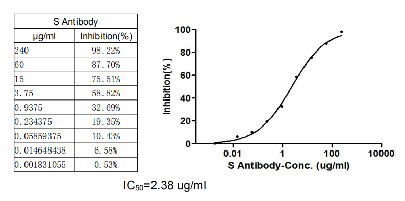 Binding signal of SARS-CoV-2-S1-RBD (CSB-YP3324GMY1) and ACE2 protein-HRP conjugate (CSB-MP866317HU) was inhibited by S Antibody (CSB-RA33245A1GMY) with the IC50 is 2.38 μg/mL