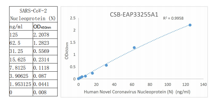 Immobilized SARS-CoV-2-N (CSB-EP3325GMY) at 2 μg/mL can bind SARS-CoV-2-N (CSB-RA33255A0GMY) Antibody, the EC50 is 6.892 ng/mL.