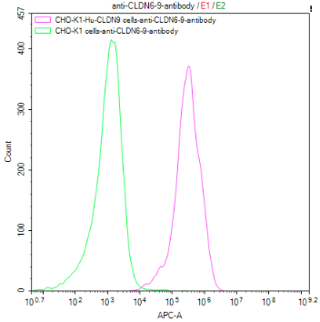 Untransfected CHO-K1 cells (green line) and transfected Human CLDN9 CHO-K1 stable cells (red line) were stained with anti-CLDN6/9 antibody(CSB-RA005508MA1HU) (2μg/1*106cells), washed and then followed by APC-conjugated anti-Human IgG Fc antibody and analyzed with flow cytometry.