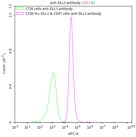 Untransfected CT26 cells (green line) and transfected Human DLL3 & CD47 CT26 stable cells (red line) were stained with anti-DLL3 antibody (CSB-RA882142MA2HU) (2μg/1*106cells), washed and then followed by APC-conjugated anti-Human IgG Fc antibody and analyzed with flow cytometry.