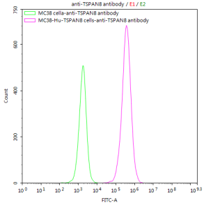 Untransfected MC38 cells (green line) and transfected Human TSPAN8 MC38 stable cells (red line) were stained with anti-TSPAN8 antibody (CSB-RA025166MA2HU) (2μg/1*106cells), washed and then followed by FITC-conjugated anti-Human IgG Fc antibody and analyzed with flow cytometry.