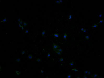 Immunofluorescence staining of Hela cells with (CSB-MA000071M2m)at 1:50, counter-stained with DAPI. The cells were fixed in 4% formaldehyde, permeabilized using 0.2% Triton X-100 and blocked in 10% normal Goat Serum. The cells were then incubated with the antibody overnight at 4°C. Nuclear DNA was labeled in blue with DAPI. The secondary antibody was FITC-conjugated AffiniPure Goat Anti-Mouse IgG (H+L).