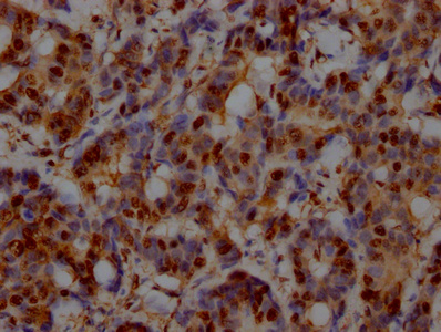 IHC image of CSB-MA000071M2m diluted at 1:500 and staining in paraffin-embedded human breast cancer performed on a Leica BondTM system. After dewaxing and hydration, antigen retrieval was mediated by high pressure in a citrate buffer (pH 6.0). Section was blocked with 10% normal goat serum 30min at RT. Then primary antibody (1% BSA) was incubated at 4°C overnight. The primary is detected by a Goat anti-rabbit polymer IgG labeled by HRP and visualized using 0.05% DAB.