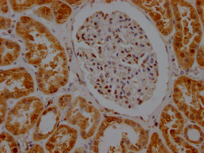 IHC image of CSB-MA000071M2m diluted at 1:500 and staining in paraffin-embedded human kidney tissue performed on a Leica BondTM system. After dewaxing and hydration, antigen retrieval was mediated by high pressure in a citrate buffer (pH 6.0). Section was blocked with 10% normal goat serum 30min at RT. Then primary antibody (1% BSA) was incubated at 4°C overnight. The primary is detected by a Goat anti-rabbit polymer IgG labeled by HRP and visualized using 0.05% DAB.