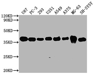 Positive WB detected in: U87 whole cell lysate, PC3 whole cell lysate, 293 whole cell lysate, U251 whole cell lysate, A549 whole cell lysate, MG-63 whole cell lysate, U251 whole cell lysate, SH-SY5Y whole cell lysate