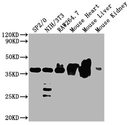 Positive WB detected in: SP2/0 whole cell lysate, NIH/3T3 whole cell lysate, Raw264.7 whole cell lysate, Mouse heart tissue, Mouse kidney tissue