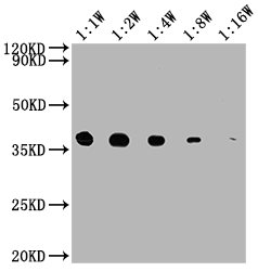 Positive WB detected in: 15μg hela whole cell lysate GAPDH antibody at 1:10000, 1:20000, 1:40000, 1:80000, 1:160000