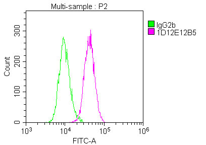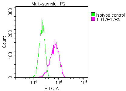 Overlay Peak curve showing Hela cells stained with CSB-MA000091M1m (red line) at 1:200. The cells were fixed in 4% formaldehyde and permeated by 0.2% TritonX-100. Then 10% normal goat serum was Incubated to block non-specific protein-protein interactions followed by the antibody (1μg/1*106cells) for 1 h at 4°C. The secondary antibody used was FITC-conjugated Goat Anti-Mouse IgG(H+L) at 1/100 dilution for 30min at 4°C. Isotype control antibody (green line) was mouse IgG2b (1μg/1*106cells) used under the same conditions. Acquisition of >10,000 events was performed.
