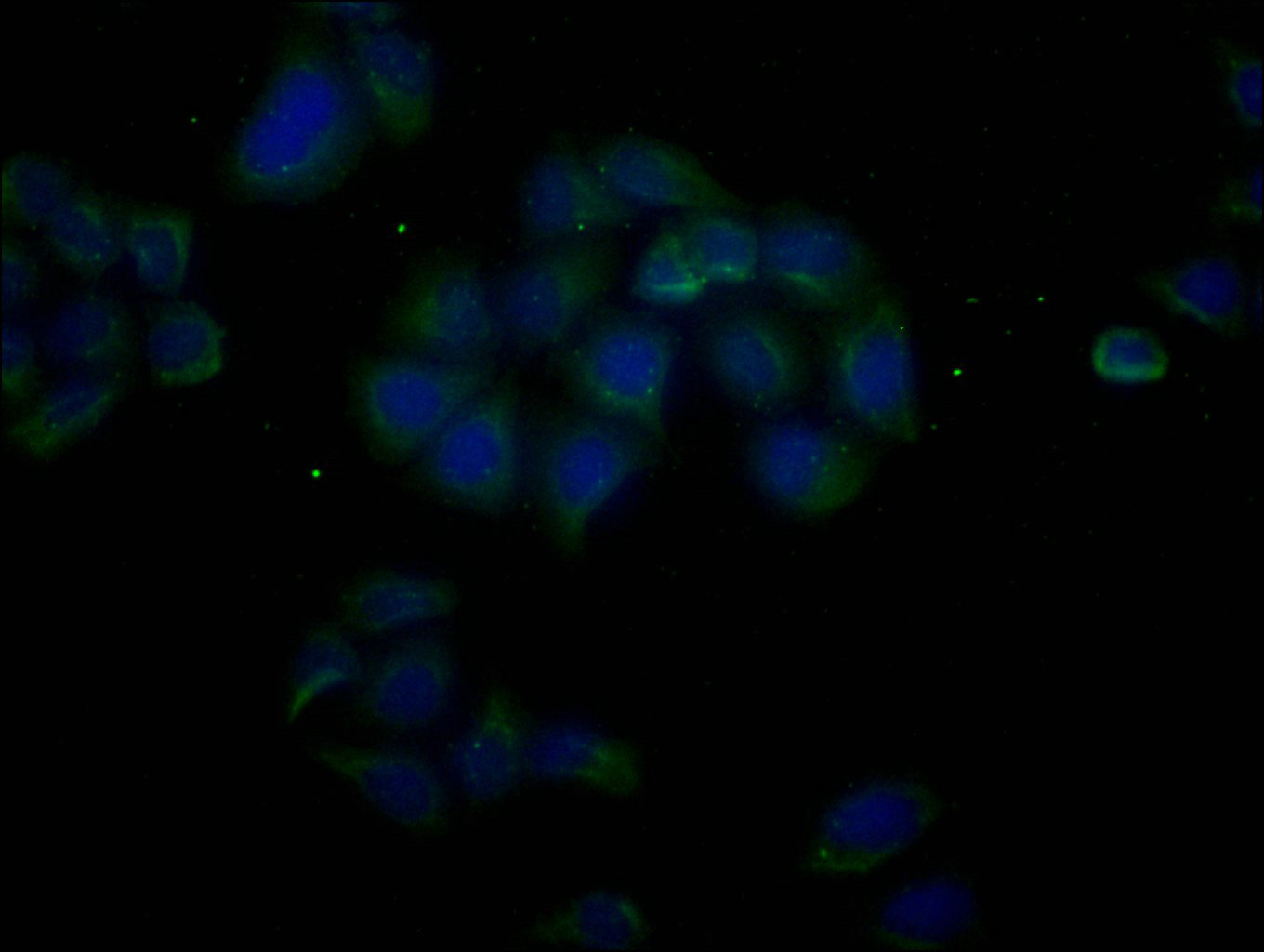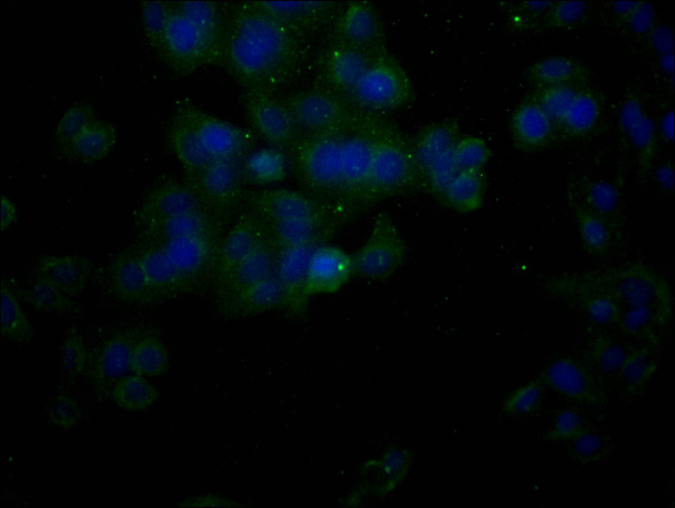Immunofluorescence staining of HepG2 cells with CSB-MA000091M1m at 1:100, counter-stained with DAPI. The cells were fixed in 4% formaldehyde, permeated by 0.2% TritonX-100, and blocked in 10% normal Goat Serum. The cells were then incubated with the antibody overnight at 4°C. Nuclear DNA was labeled in blue with DAPI. The secondary antibody was FITC-conjugated AffiniPure Goat Anti-Mouse IgG (H+L).
