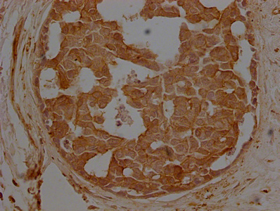 IHC image of CSB-MA000091M1m diluted at 1:500 and staining in paraffin-embedded breast cancer performed on a Leica BondTM system. After dewaxing and hydration, antigen retrieval was mediated by high pressure in a citrate buffer (pH 6.0). Section was blocked with 10% normal goat serum 30min at 37℃ Then primary antibody (1% BSA) was incubated at 4°C overnight. The primary is detected by a Goat anti-Mouse IgG labeled by HRP and visualized using 0.05% DAB.