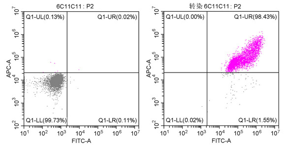 Two-color flow cytometric analysis showing 293F cells untransfected (Left) or transfected with GFP (Right) stained with CSB-MA000051M1m at 1:200. The cells were fixed in 70% ethanol at 4℃ overnight. Then 10% normal goat serum was Incubated to block non-specific protein-protein interactions followed by the antibody (1μg/1*106cells) for 1 h at 4°C. The secondary antibody used was Alexa Fluor 647 AffiniPure Donkey Anti-Mouse IgG (H+L) at 1/250 dilution for 30min at 4°C.