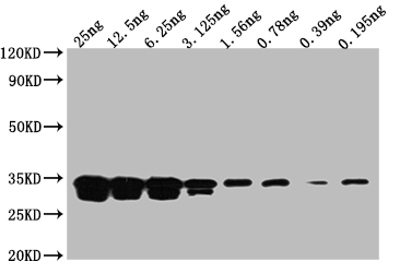 Positive WB detected in: Recombinant protein at 25ng, 12.5ng, 6.25ng, 3.125ng, 1.56ng, 0.78ng, 0.39ng, 0.195ng