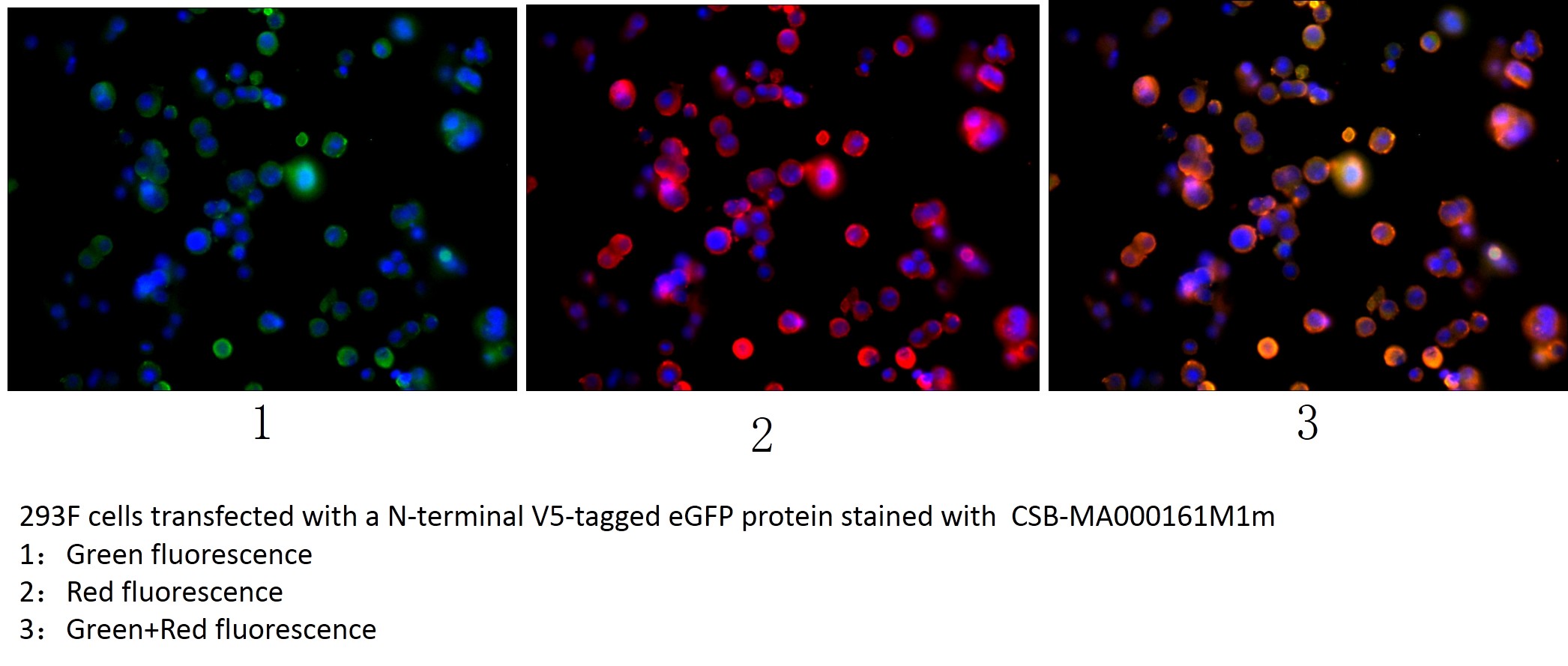 Immunofluorescence staining of transfected HEK293F cells with CSB-MA000161M1m at 1:100, counter-stained with DAPI. The cells were fixed in 4% formaldehyde, permeabilized using 0.2% Triton X-100 and blocked in 10% normal Goat Serum. The cells were then incubated with the antibody overnight at 4°C. The secondary antibody was Alexa Fluor R-PE Goat Anti-Mouse IgG(H+L).