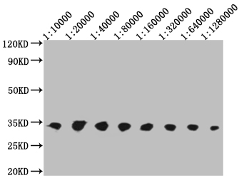 V5 Tag antibody at 1:10000, 1:20000, 1:40000, 1:80000, 1:160000, 1:320000, 1:640000, 1:1280000