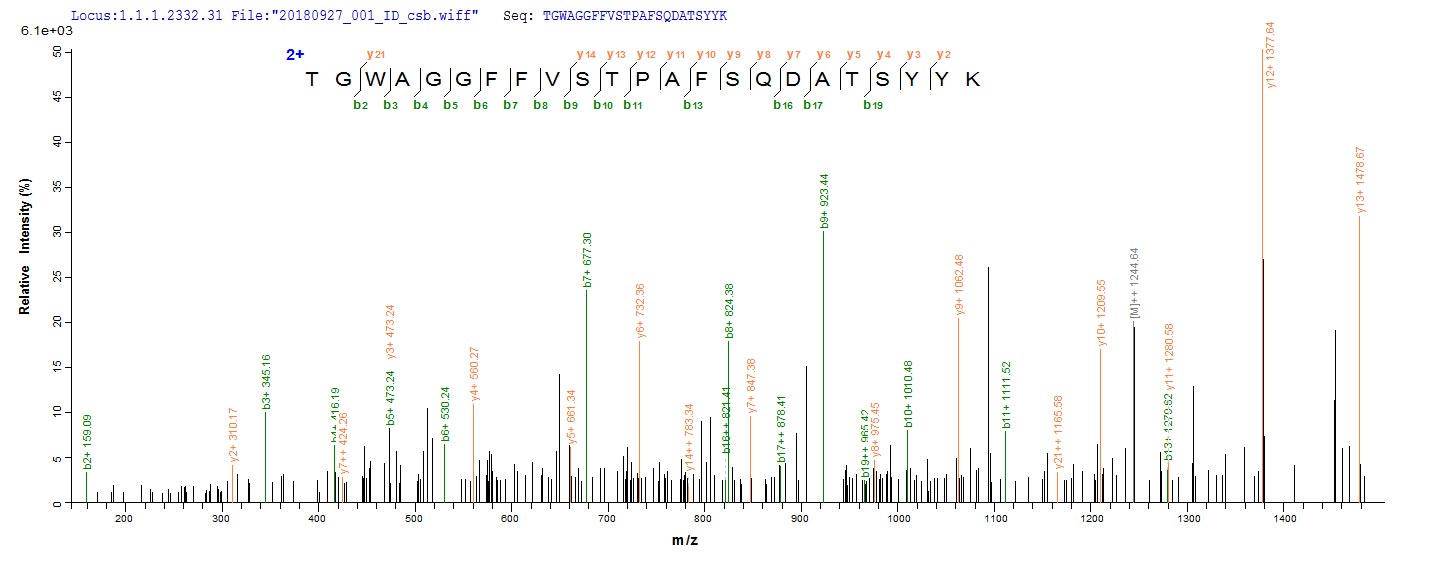 Based on the SEQUEST from database of E.coli host and target protein, the LC-MS/MS Analysis result of CSB-CF008424MO could indicate that this peptide derived from E.coli-expressed Mus musculus (Mouse) Fap.