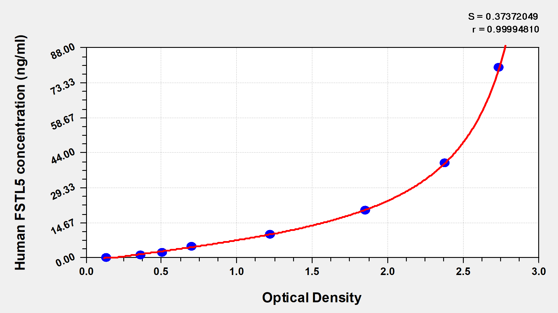 通過線性范圍來計算出實際的檢測樣本值,定量試劑盒標準曲線的相關系數R大于0.99。以CSB-E07270h(人脂聯素(ADP)ELISA Kit)為例的標準曲線。