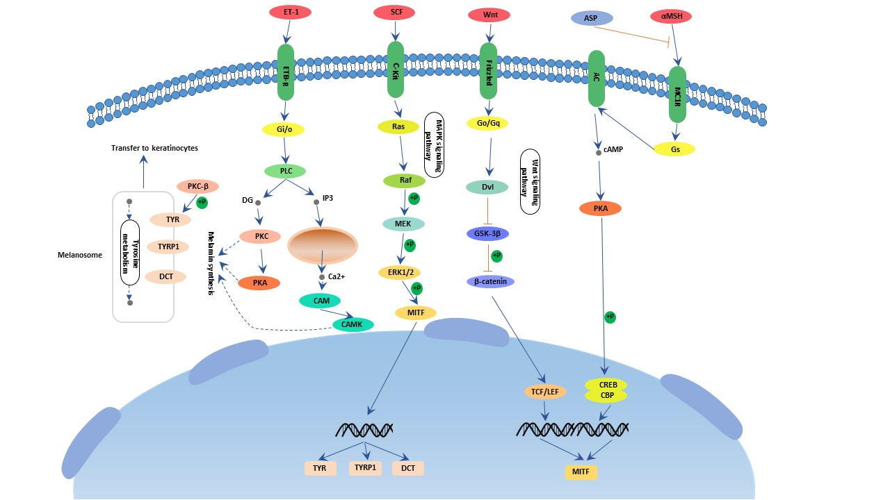 黑素生成最重要的正調節因子是MC1受體及其配體黑素皮質肽。