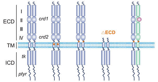 ERBB3和其它EGFR家族成員一樣,由胞外配體結(jié)合域、跨膜結(jié)構(gòu)域和胞內(nèi)結(jié)構(gòu)域3部分組成。胞內(nèi)區(qū)分為近膜區(qū)、激酶結(jié)構(gòu)域和C端尾結(jié)構(gòu)域。近膜區(qū)分為近膜A區(qū)(JM-A)和B區(qū)(JM-B)。