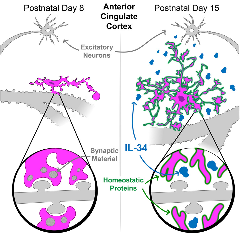 杜克大學Staci D. Bilbo團隊在《Immunity》發表研究,揭示神經元來源的白細胞介素-34(IL-34)在小鼠前扣帶回皮層(ACC)發育中調控小膠質細胞成熟與突觸修剪的關鍵作用。研究發現,IL-34在出生后第二周顯著上調,主要由興奮性神經元表達,其缺失會導致小膠質細胞數量減少、成熟標志物TMEM119表達降低,并異常增加突觸吞噬。急性阻斷IL-34會重新激活突觸修剪,而過表達IL-34則抑制這一過程。此外,IL-34缺失小鼠表現出焦慮樣行為減少和認知靈活性缺陷。該研究將IL-34確定為神經元與小膠質細胞“對話”的關鍵介質,為神經發育疾病提供了新的干預靶點。
