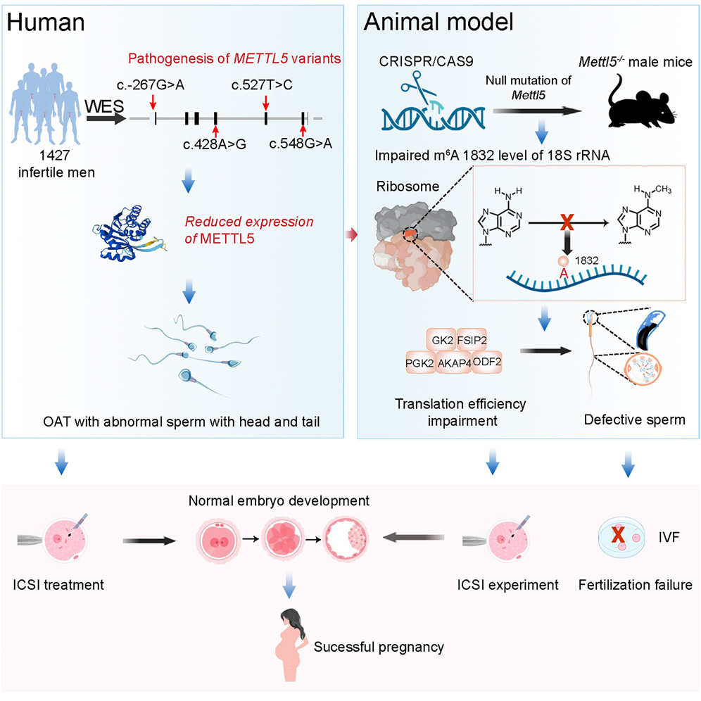 廣州醫科大學陳浩教授、四川大學許文明教授、中山大學林水賓教授和中南大學譚躍球教授課題組合作,在《Molecular Therapy》發表研究,揭示核糖體RNA甲基化酶METTL5缺失導致男性少弱畸形精子癥(OAT)的分子機制。研究發現,METTL5突變與男性不育相關,其缺失導致18S rRNA的m6A修飾顯著降低,影響精子發生過程中的基因表達調控。通過小鼠模型和臨床樣本分析,發現METTL5缺失的精子可通過單精子注射技術(ICSI)實現成功妊娠。該研究為男性不育的診斷和治療提供了新的潛在靶點。