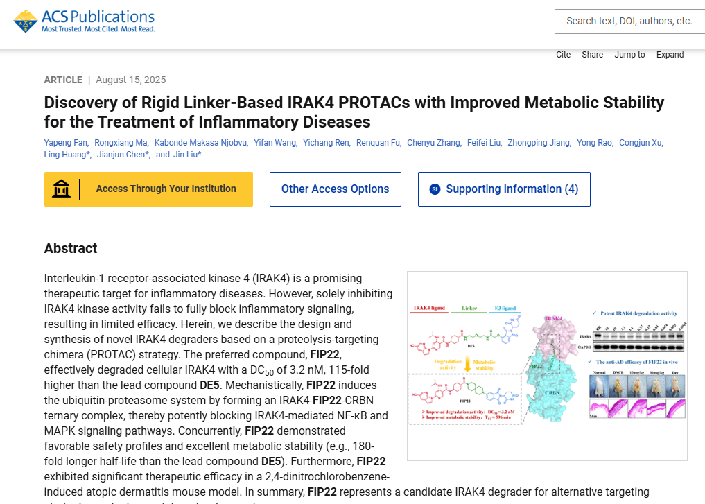 海南大學(xué)劉進(jìn)/黃玲團(tuán)隊(duì)聯(lián)合南方醫(yī)科大學(xué)陳建軍在《Journal of Medicinal Chemistry》發(fā)表研究,報(bào)道了新型IRAK4降解劑FIP22的發(fā)現(xiàn)。該研究針對(duì)炎癥關(guān)鍵靶點(diǎn)IRAK4,通過PROTAC技術(shù)設(shè)計(jì)并合成了一系列剛性連接鏈IRAK4降解劑。其中,F(xiàn)IP22展現(xiàn)出皮摩爾級(jí)降解效力(DC?? = 3.2 nM),在特應(yīng)性皮炎小鼠模型中顯著緩解皮膚炎癥,且安全性良好。研究還揭示了FIP22通過增強(qiáng)三元復(fù)合物穩(wěn)定性實(shí)現(xiàn)高效降解的分子機(jī)制,為治療IRAK4驅(qū)動(dòng)的炎癥疾病提供了新的候選藥物。
