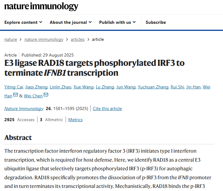 [4]E3 ligase RAD18 targets phosphorylated IRF3 to terminate IFNB transcription.Nat Immunol,2025 Sep