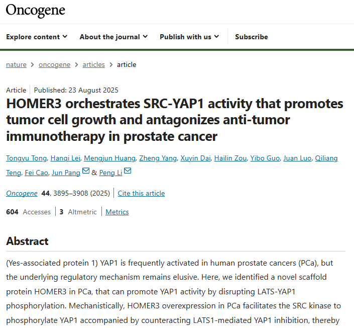 [5]HOMER3 orchestrates SRC-YAP1 activity that promotes tumor cell growth and antagonizes anti-tumor immunotherapy in prostate cancer.Oncogene,2025 Oct