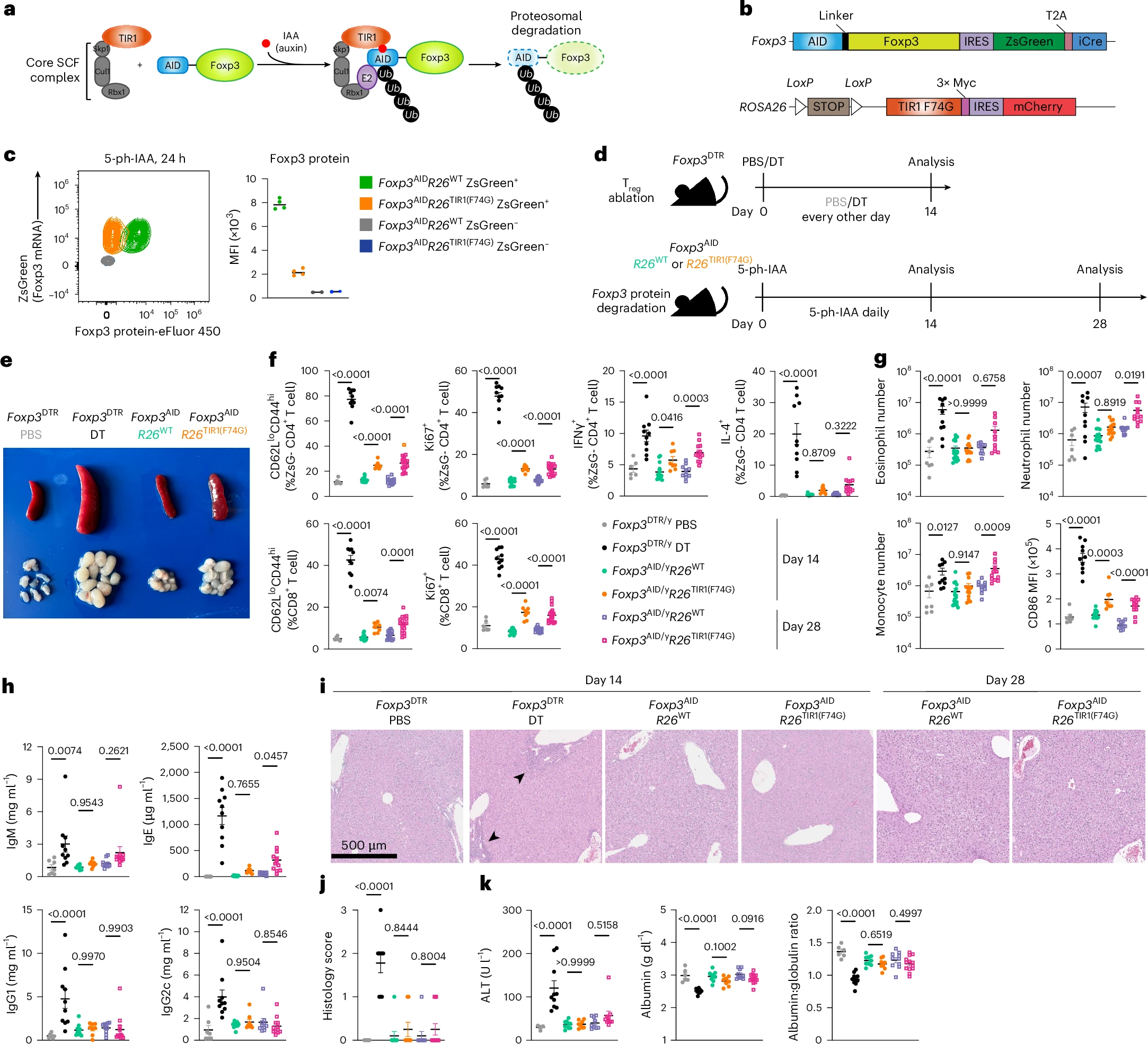 2025年10月9日,中國科學院重慶綠色智能技術研究院李禮課題組在《PNAS》發表研究,揭示了轉錄因子Ikzf1與Myb復合體通過調控長鏈非編碼RNA irf8-2抑制Irf8活性,進而調控粒細胞和巨噬細胞發育的新機制。研究利用斑馬魚和小鼠模型發現,Ikzf1/Myb在髓系前體細胞分化為粒細胞中發揮關鍵作用,其結合irf8基因組調控元件誘導irf8-2表達,抑制Irf8活性。在斑馬魚中,過表達Ikzf1/Myb促進粒細胞生成,抑制巨噬細胞產生,而雙突變體則相反。進一步實驗表明,irf8-2與RNA結合蛋白zfp36l1互作,促進irf8 mRNA降解,驅動髓系前體細胞向粒細胞分化。小鼠實驗也證實了這一機制的保守性。該研究為理解髓系細胞發育機制及血液疾病治療提供了新思路。04、靶點:Foxp3