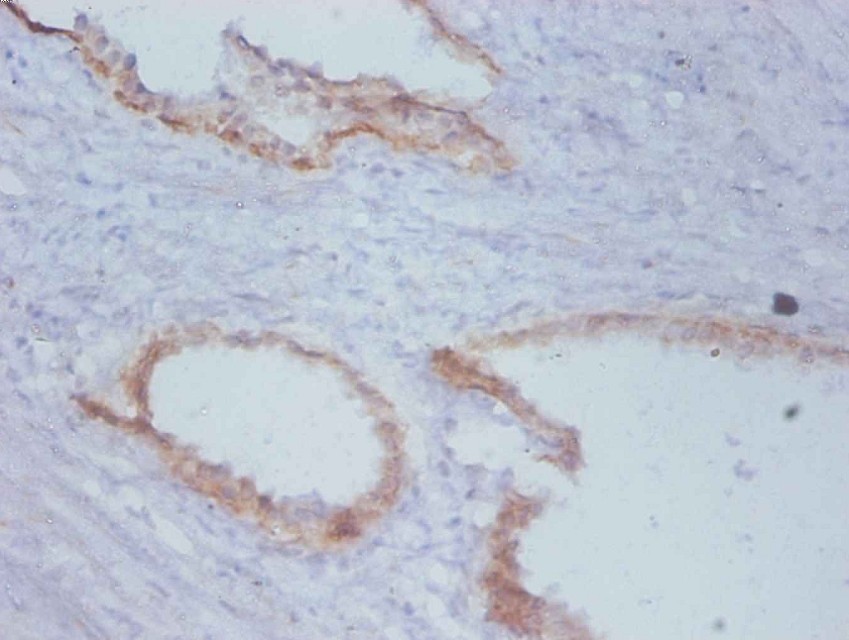 Immunohistochemical of paraffin-embedded human prostate cancer using monocolonal antibody at dilution of 1:100